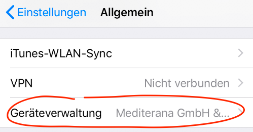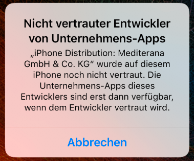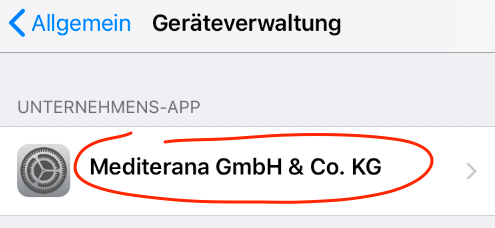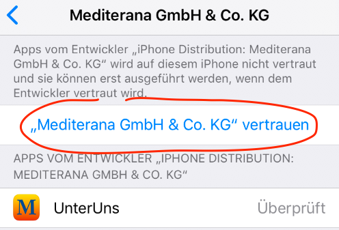 Unter der Überschrift "Unternehmens-App" wird Ihnen ein Profil für den Entwickler Mediterana GmbH & Co. KG angezeigt.