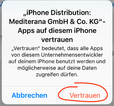 Tippen Sie auf "Mediterana GmbH & Co. KG" vertrauen und bestätigen Sie Ihre Auswahl.